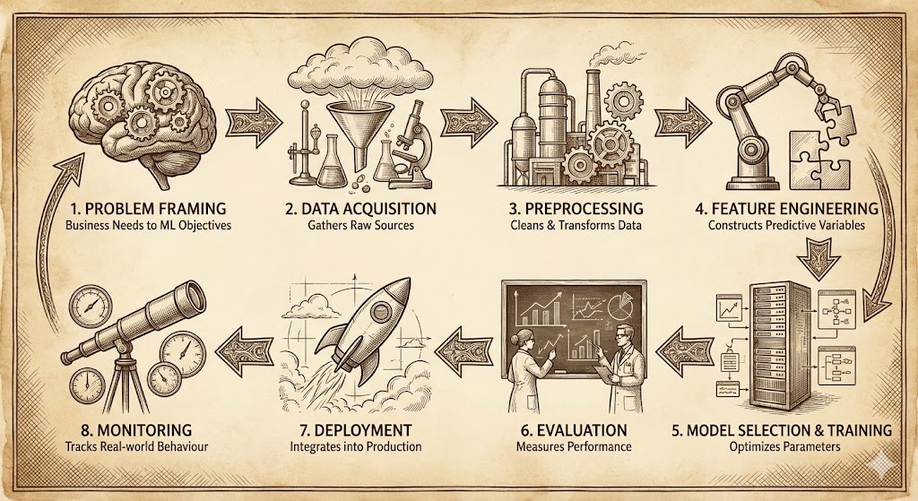 - Map the lifecycle of a machine learning system from initial problem formulation through post-deployment monitoring.